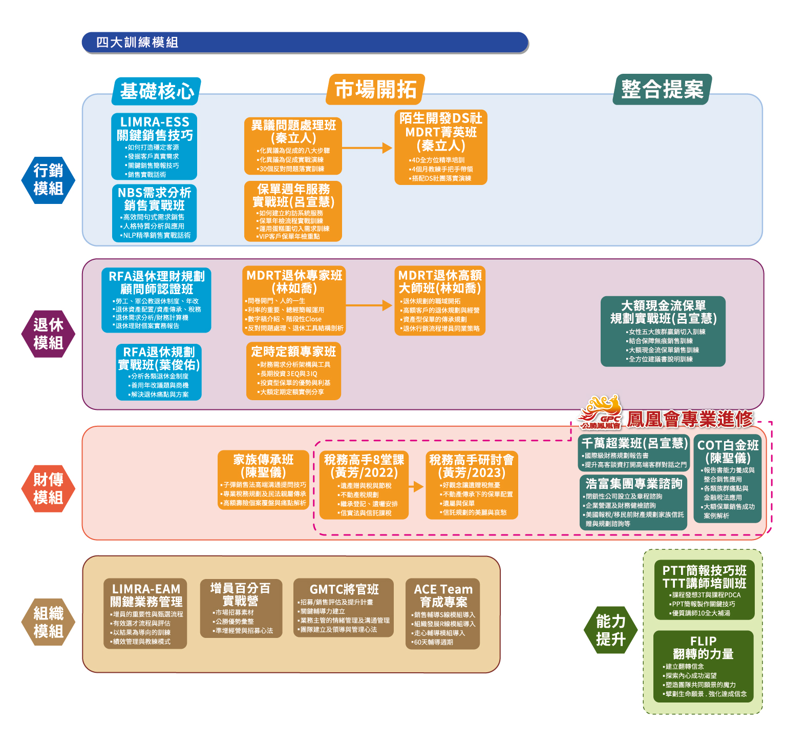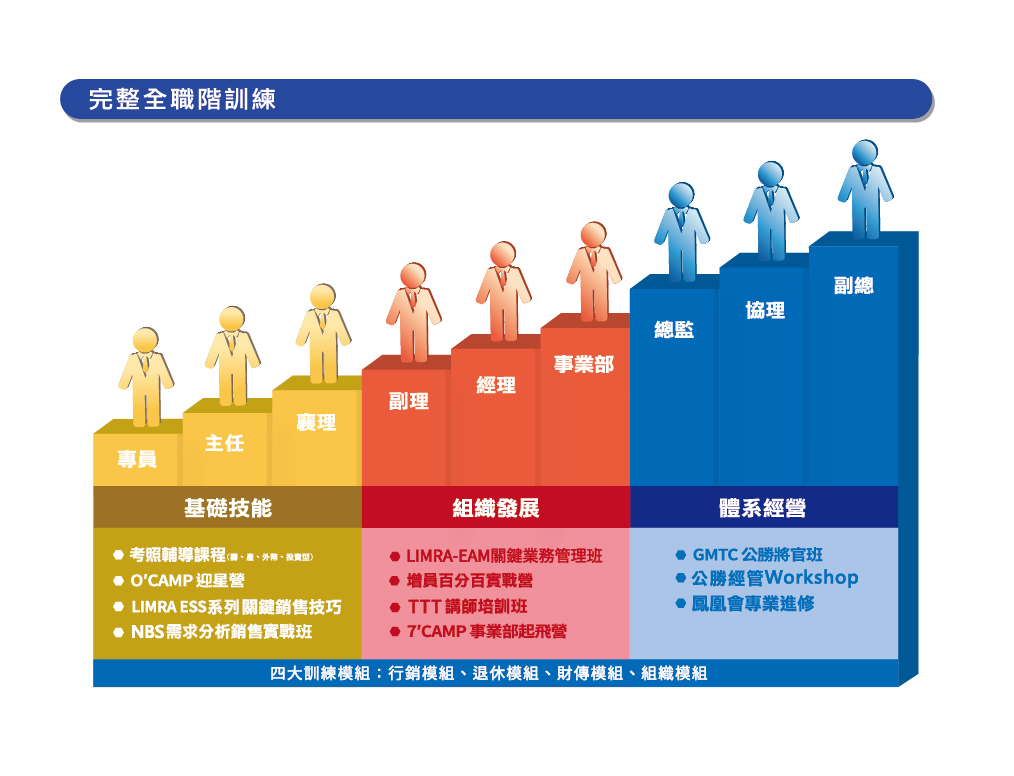 行銷、退休、財傳、組織四大訓練模組,提供提供全方位學習平台